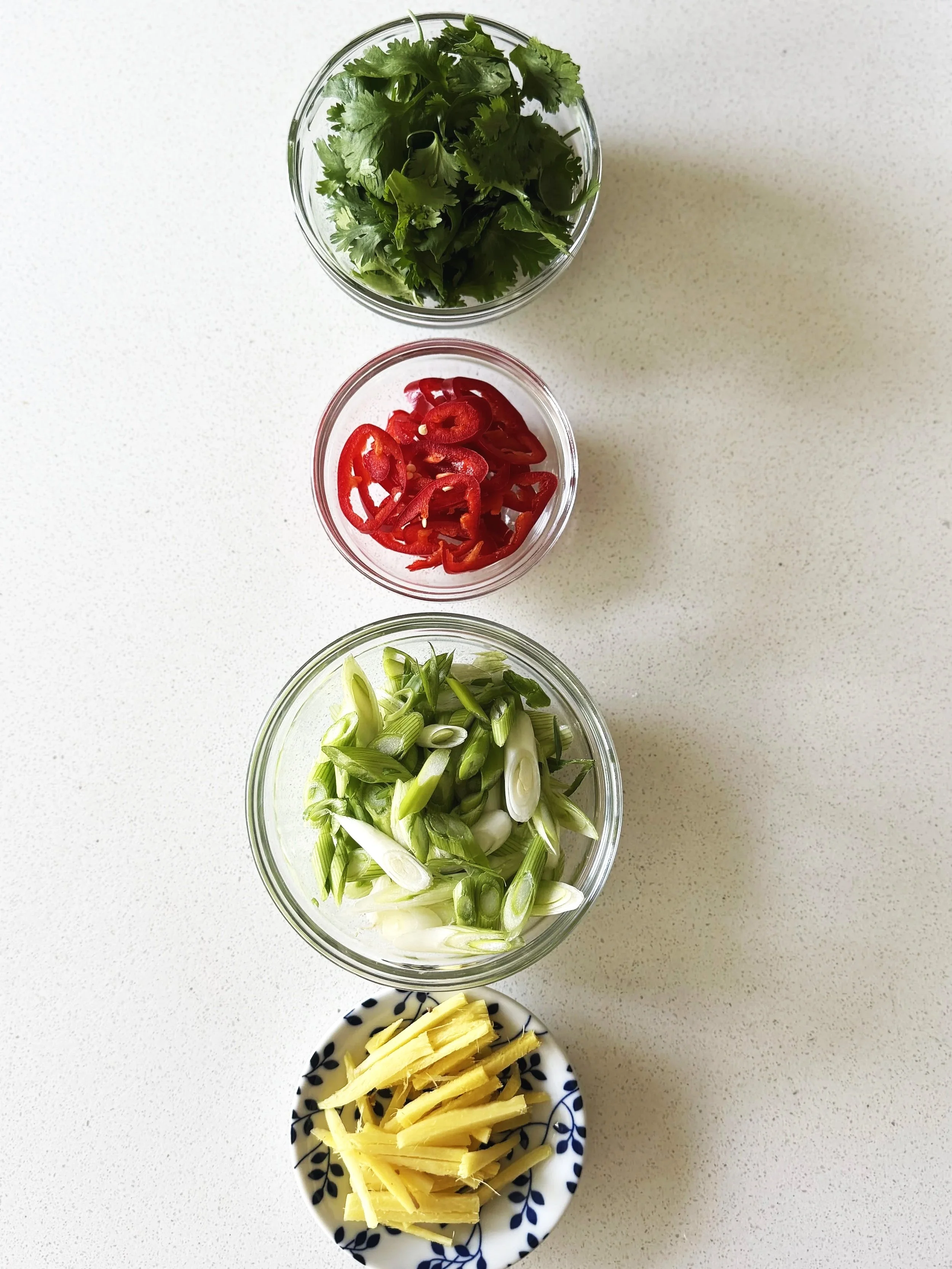 Aromatics, mise en place. Ginger, Spring Onions, Red Chili Peppers, Cilantro