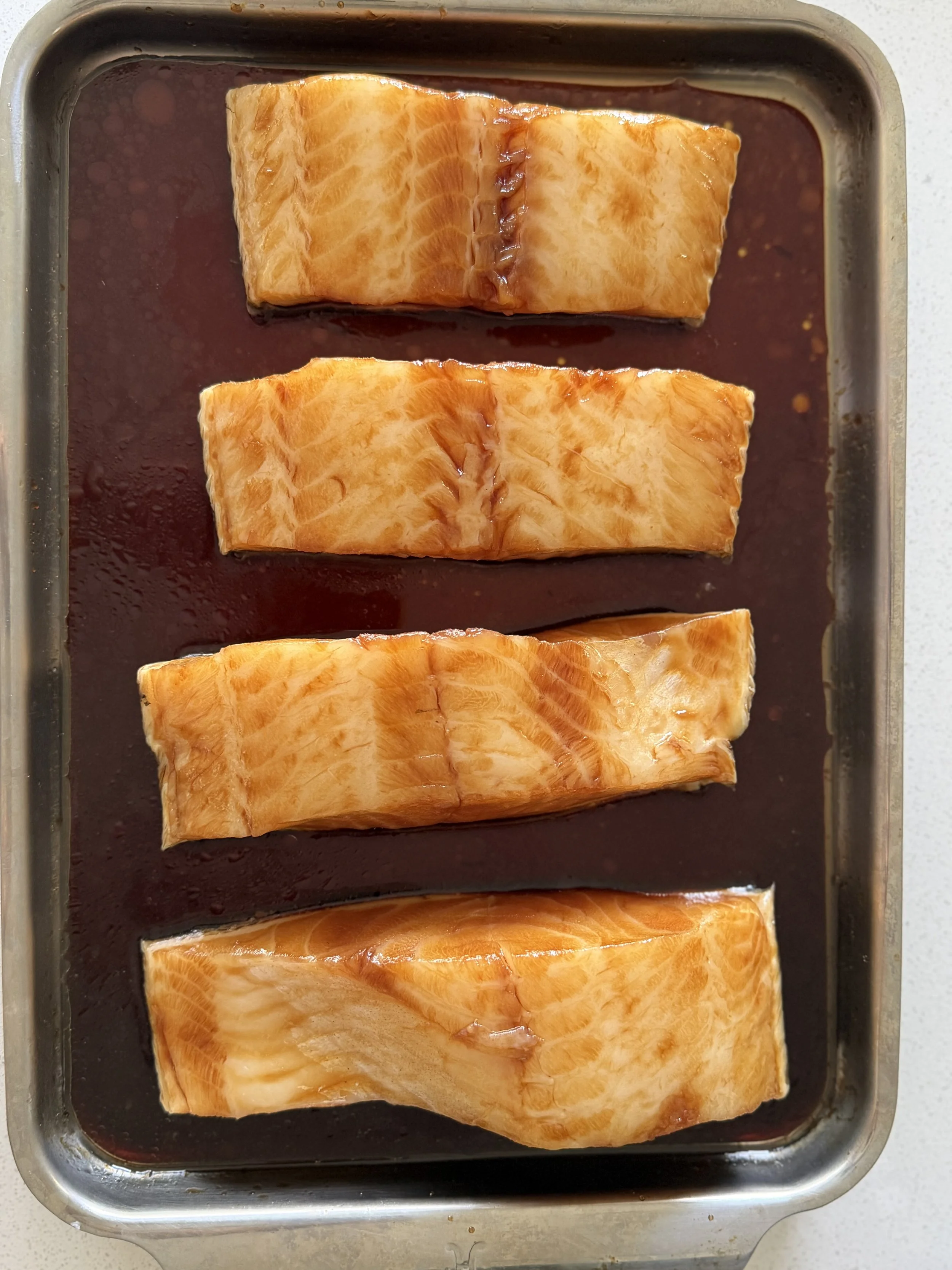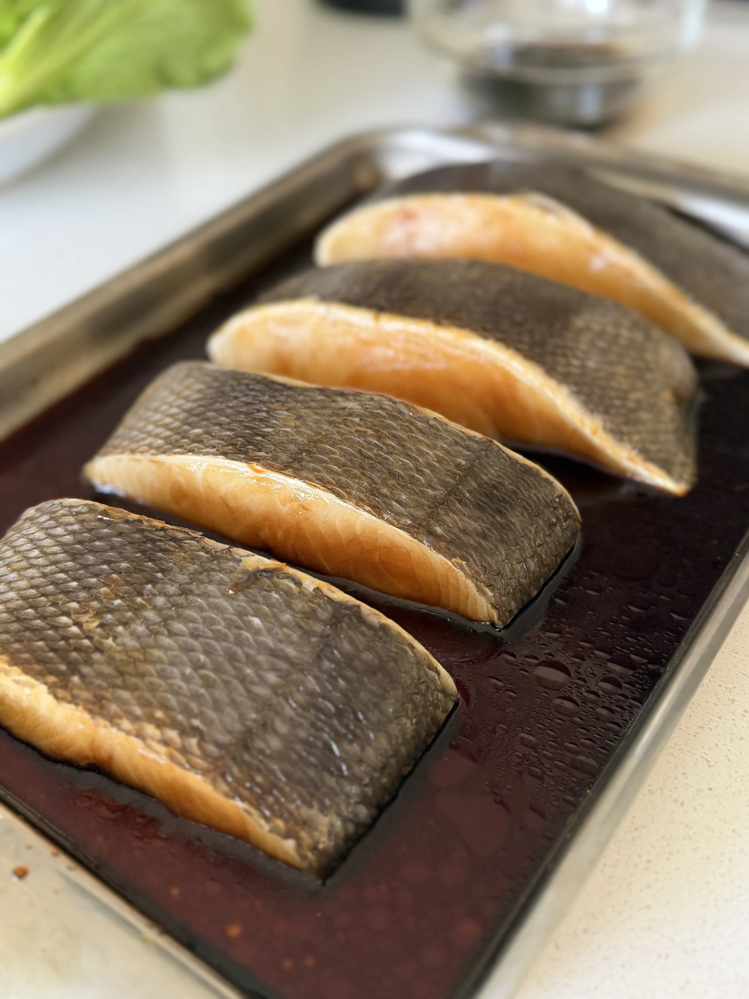 Marinate the Fish Pour ¾ of the Sauce into a small-to-medium baking dish that comfortably fits the fillets. Place the seasoned Fish into the sauce, gently turning to coat all sides. Leave skin side up and allow to marinate for 20 minutes while you prepare the Aromatics and finish preheating the oven.