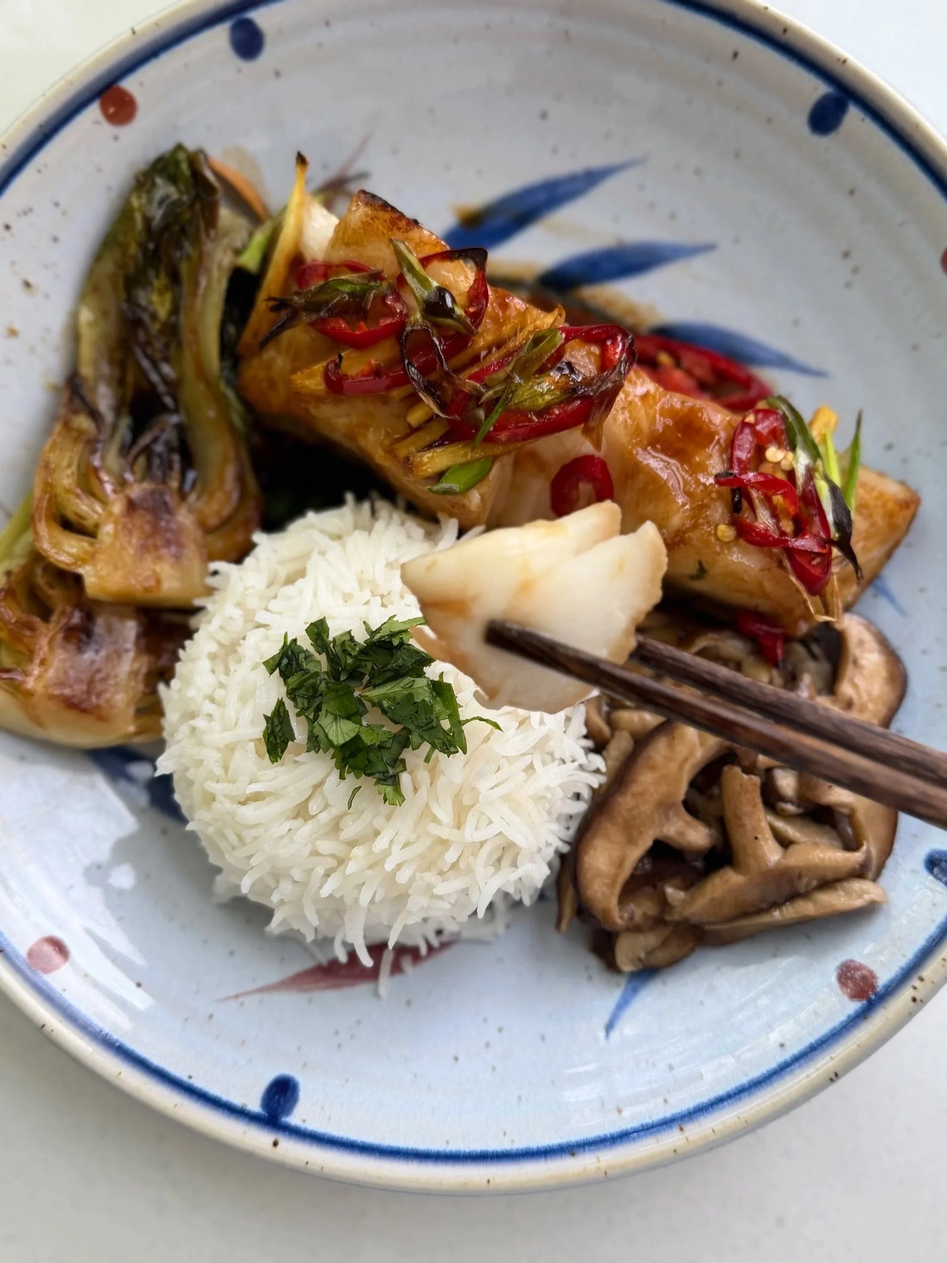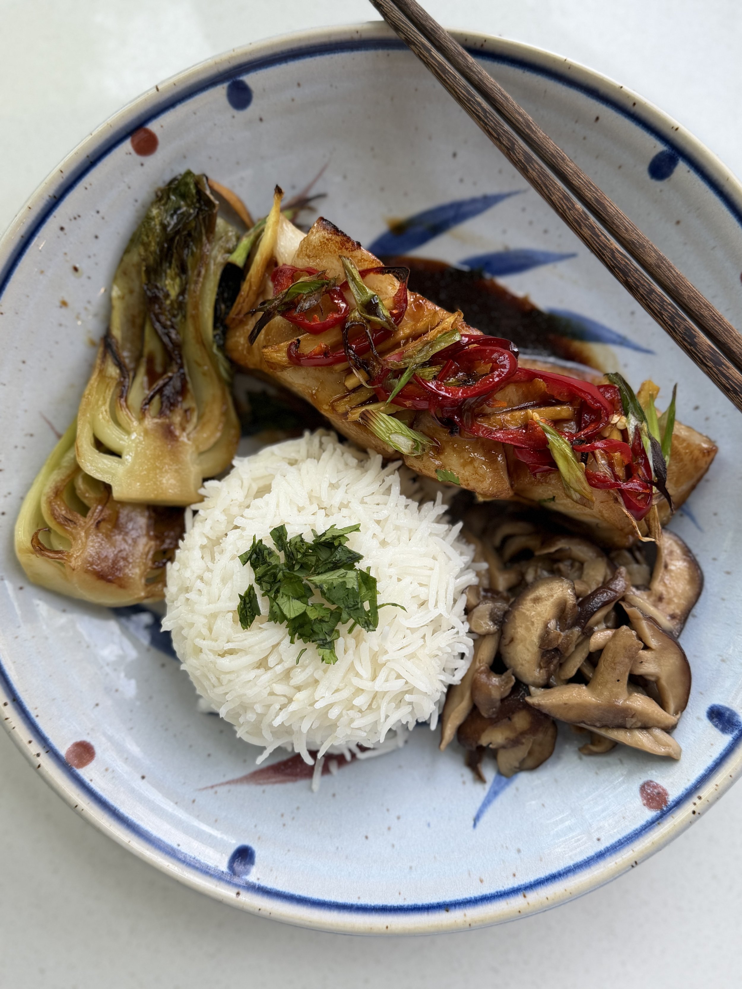 Plated here with steamed Rice, Boy Choy & Shiitake Mushrooms