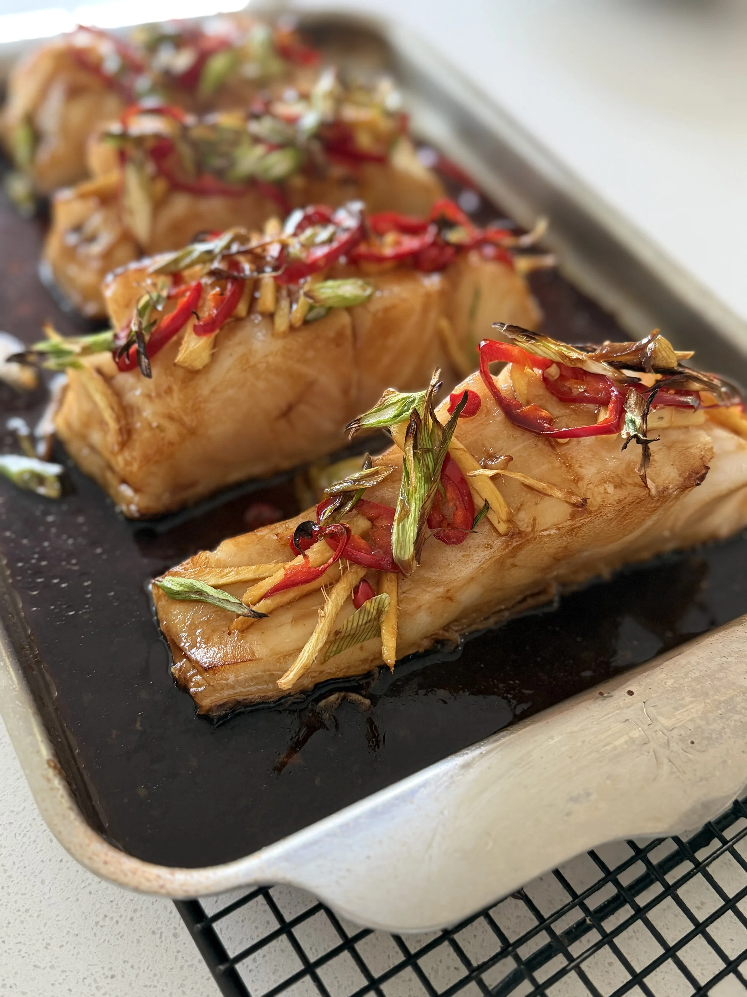 A quick marinade, a handful of aromatics, and just 14 minutes in the oven transforms this beautiful fish into something special. Served over steamed Jasmine or Basmati Rice with Vegetables, it becomes a balanced, nourishing meal that feels both comforting and elevated. Naturally gluten-free, rich in clean protein, light and energizing.