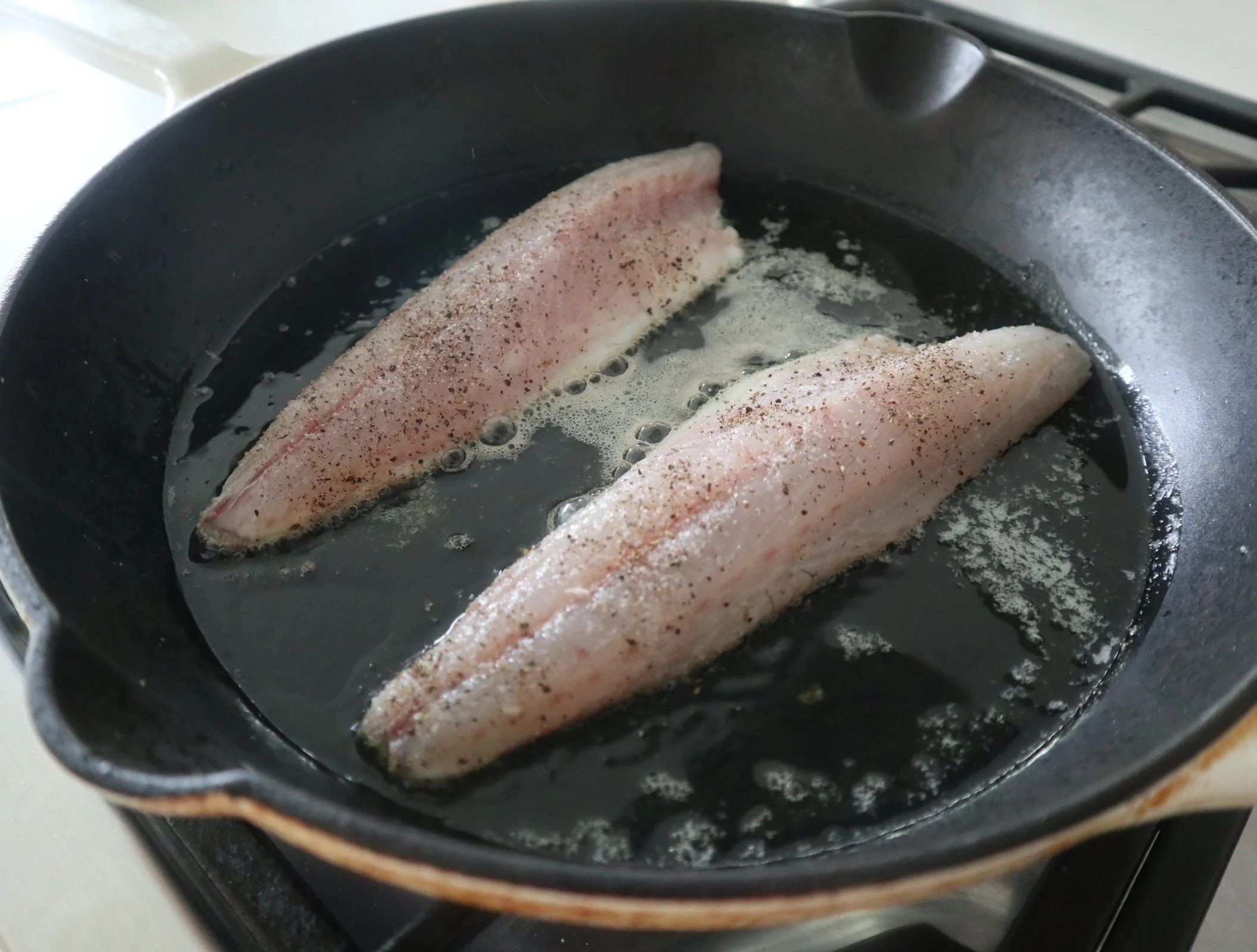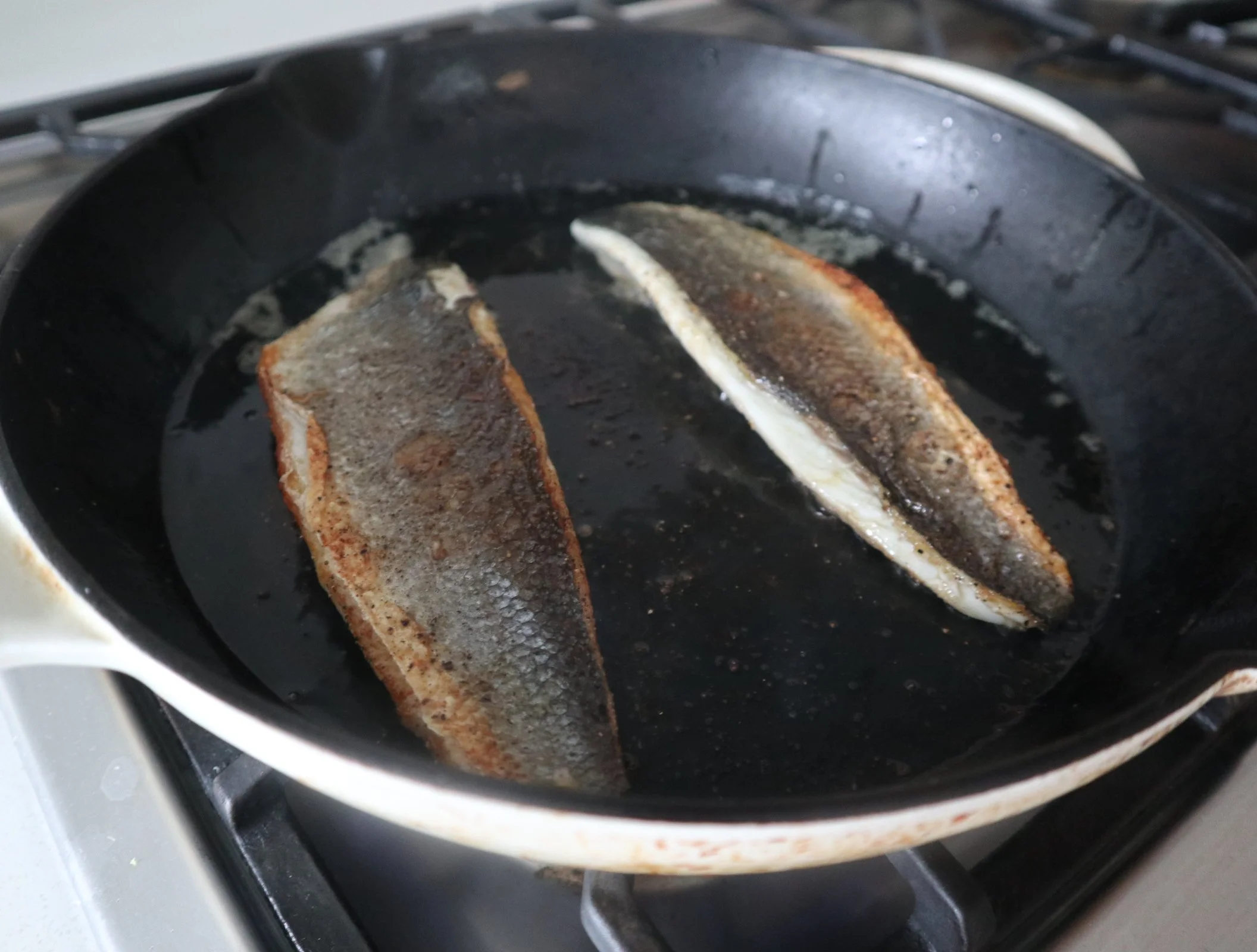 Heat a cast iron skillet or stainless steel pan with 2 Tbsps. Olive Oil and 2 Tbsps. Butter until hot. Carefully add in seasoned Branzino Fillets skin side down and reduce heat to medium-high. Cook for 3-4 minutes until the skin is nice and crispy before carefully flipping over. A fish spatula is a good idea.