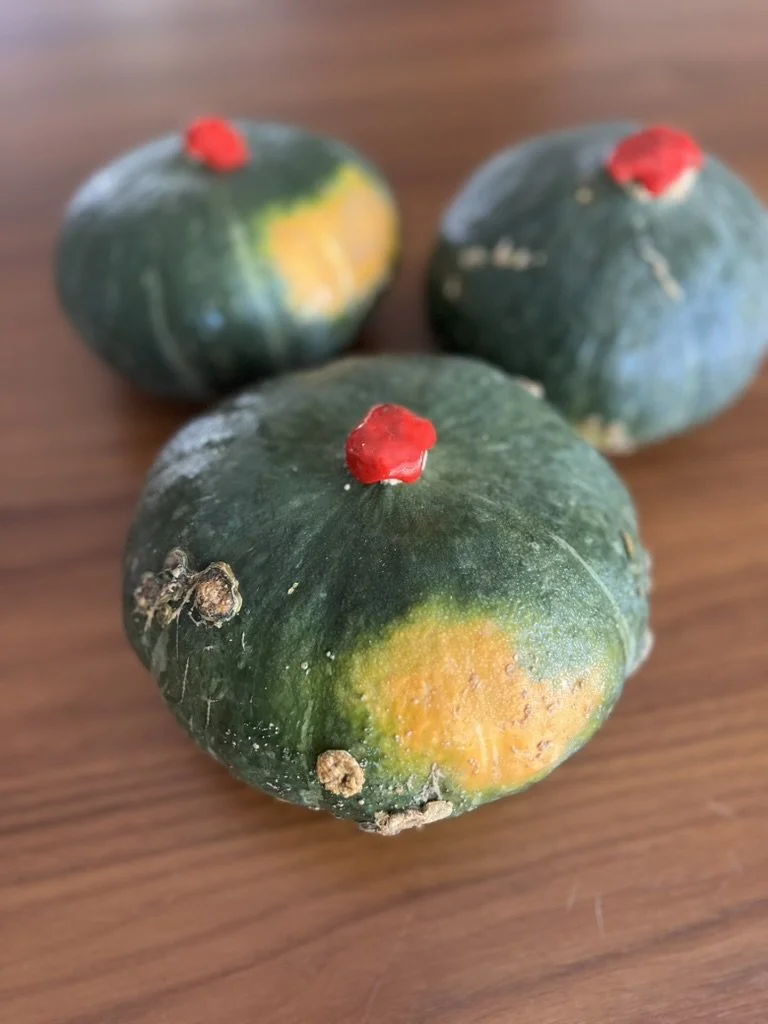 Japanese Pumpkins are strikingly unique with a dark green exterior and velvety bright orange interior. The thick, woody stem is sometimes capped with a red wax seal to seal in freshness.