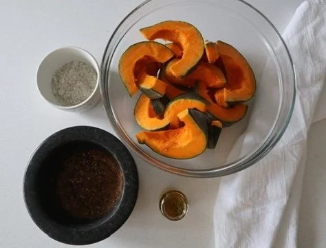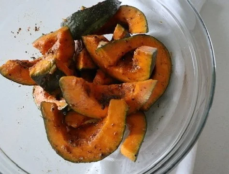 Marinate the Squash with crushed Spices, 1/4 cup Olive Oil and 1 Tsp. Celtic Sea Salt.