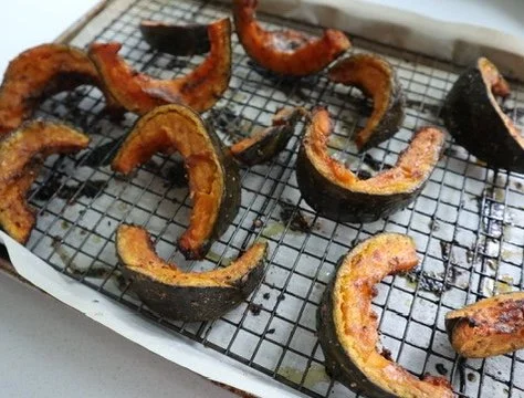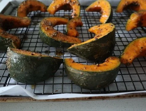 Squash on an elevated roasting pan, baking sheet underneath lined with parchment for easier clean up.