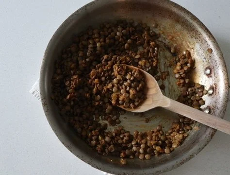 In a medium pan, heat a tsp. Olive Oil with 1 tsp. crushed Spices and 1/2 tsp. Turmeric Powder. Add in cooked Lentils and cook for 2 minutes until the Spices incorporate into the cooked Lentils. Set aside.