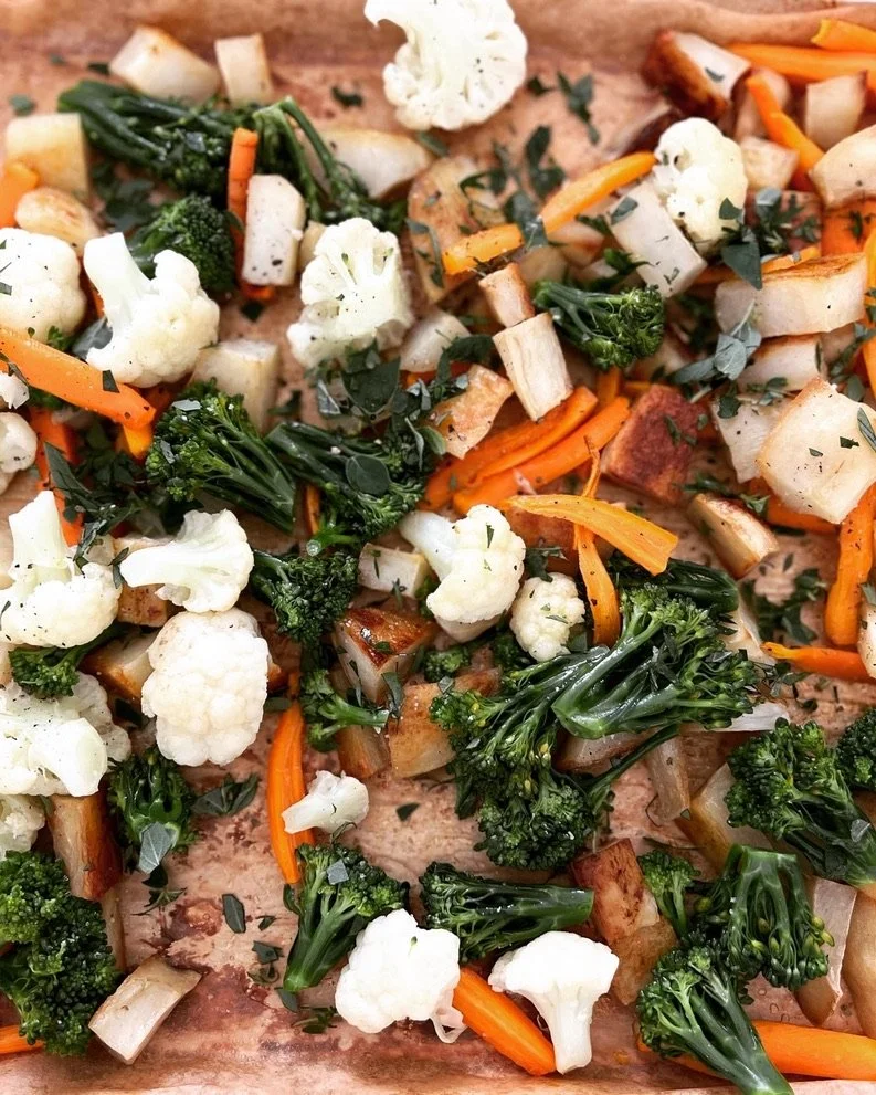 Peel and cut Potatoes and Carrots into bite size somewhat similar rectangular pieces. I like to keep my carrots on the longer side. Cut Baby Broccoli and Cauliflower into bite size uniform pieces for even cooking. Place Potatoes and Carrots on a baking sheet lined with parchment paper. Season with Olive Oil, Salt & Pepper and roast in a 400f oven until cooked through and starting to brown. The carrots will take less time to cook, remove them from the oven first and set aside. Lightly steam Broccoli and Cauliflower until just cooked through. Place all your Vegetables onto the baking sheet once your Potatoes are done and have slightly cooled and stir in Butter. Season with Salt & Pepper, mix in your Thyme and return to oven for ten minutes while the Butter melts and flavors mingle.